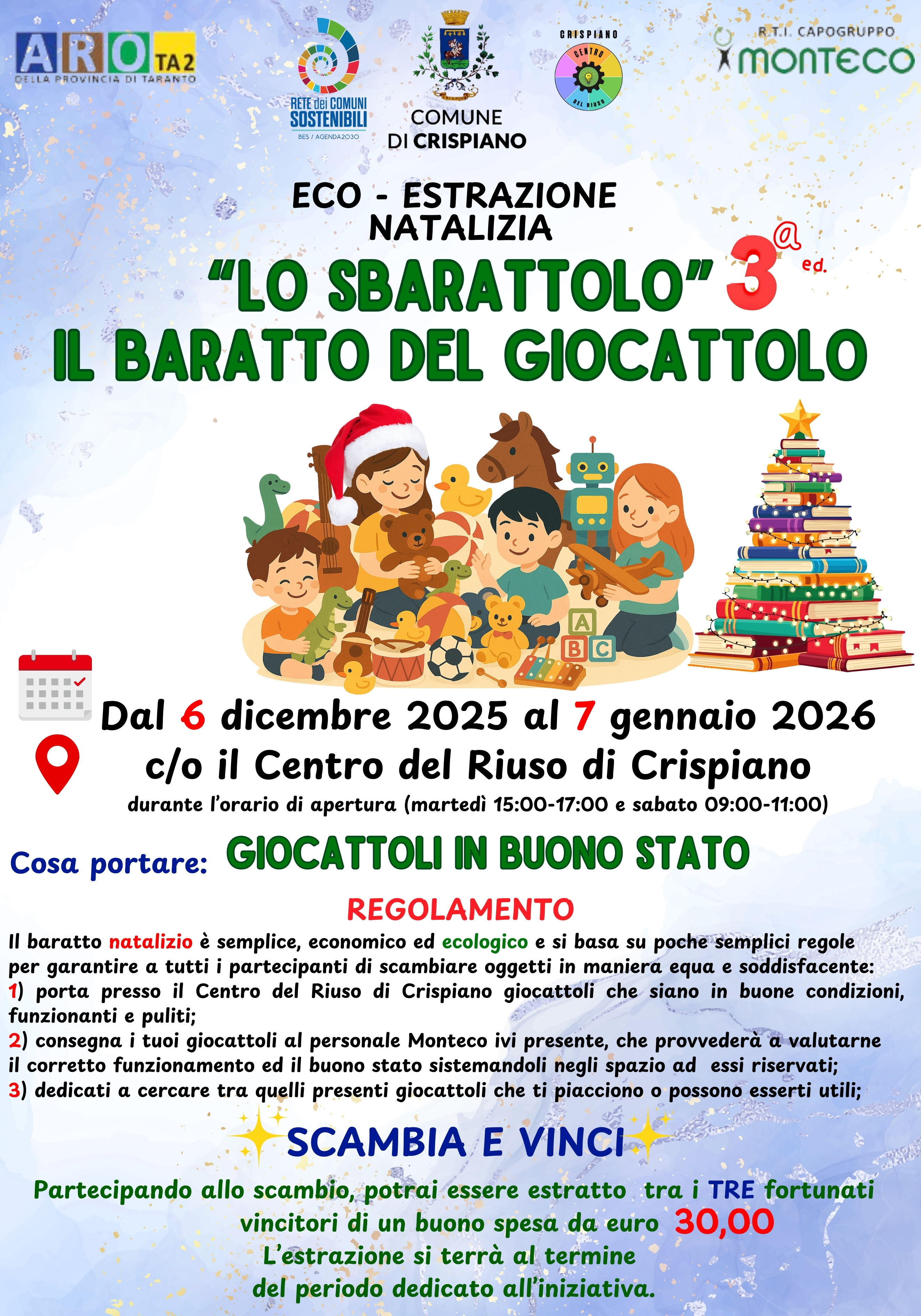 Dal 6 dicembre 2025 al 7 gennaio 2026, c/o il Centro del Riuso di Crispiano durante l’orario di apertura (martedì 15:00-17:00 e sabato 09:00-11:00).
