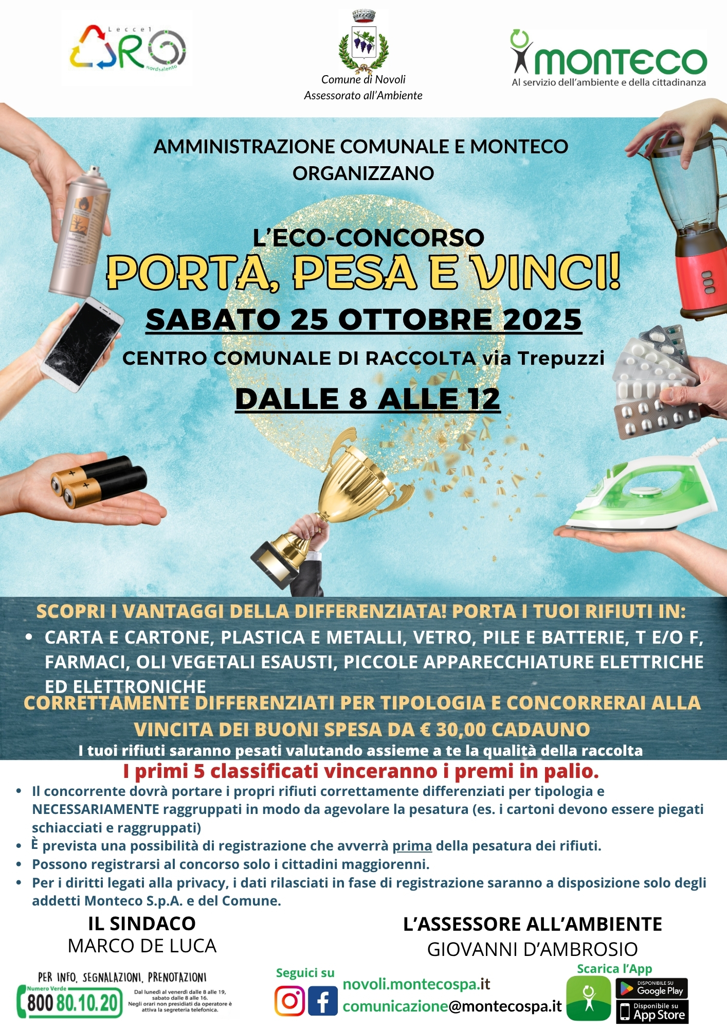 L’Eco Concorso “Porta Pesa e Vinci...a Novoli”, organizzato dall'Amministrazione Comunale e Assessorato all'Ambiente in collaborazione con Monteco S.p.A. torna a Novoli con l’obiettivo di promuovere i vantaggi della Raccolta Differenziata per incentivare la cittadinanza ad una corretta differenziazione dei rifiuti, stimolandone maggiormente l'impegno e il senso civico mediante una competizione virtuosa a premi.