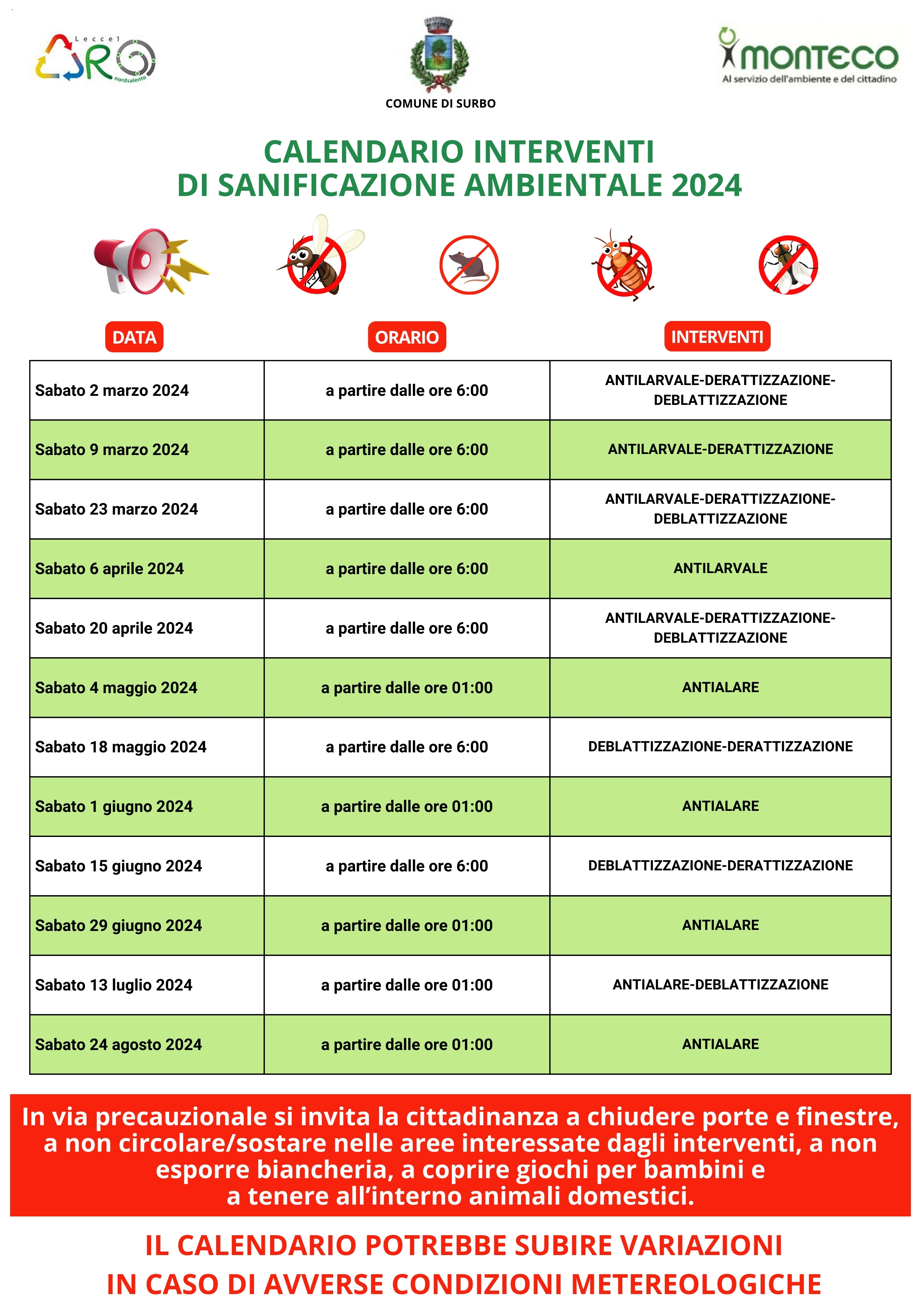 Per le date indicate nel calendario di INTERVENTI DI SANIFICAZIONE AMBIENTALE 2024, si invita tutta la cittadinanza del Comune di Surbo 𝗮 𝗰𝗵𝗶𝘂𝗱𝗲𝗿𝗲 𝗽𝗼𝗿𝘁𝗲 𝗲 𝗳𝗶𝗻𝗲𝘀𝘁𝗿𝗲, 𝗮 𝗻𝗼𝗻 𝗰𝗶𝗿𝗰𝗼𝗹𝗮𝗿𝗲/𝘀𝗼𝘀𝘁𝗮𝗿𝗲 𝗻𝗲𝗹𝗹𝗲 𝗮𝗿𝗲𝗲 𝗶𝗻𝘁𝗲𝗿𝗲𝘀𝘀𝗮𝘁𝗲 𝗱𝗮𝗴𝗹𝗶 𝗶𝗻𝘁𝗲𝗿𝘃𝗲𝗻𝘁𝗶, 𝗮 𝗻𝗼𝗻 𝗲𝘀𝗽𝗼𝗿𝗿𝗲 𝗯𝗶𝗮𝗻𝗰𝗵𝗲𝗿𝗶𝗮, 𝗮 𝗰𝗼𝗽𝗿𝗶𝗿𝗲 𝗴𝗶𝗼𝗰𝗵𝗶 𝗽𝗲𝗿 𝗯𝗮𝗺𝗯𝗶𝗻𝗶 𝗲 𝗮 𝘁𝗲𝗻𝗲𝗿𝗲 𝗮𝗹𝗹'𝗶𝗻𝘁𝗲𝗿𝗻𝗼 𝗮𝗻𝗶𝗺𝗮𝗹𝗶 𝗱𝗼𝗺𝗲𝘀𝘁𝗶𝗰𝗶.
