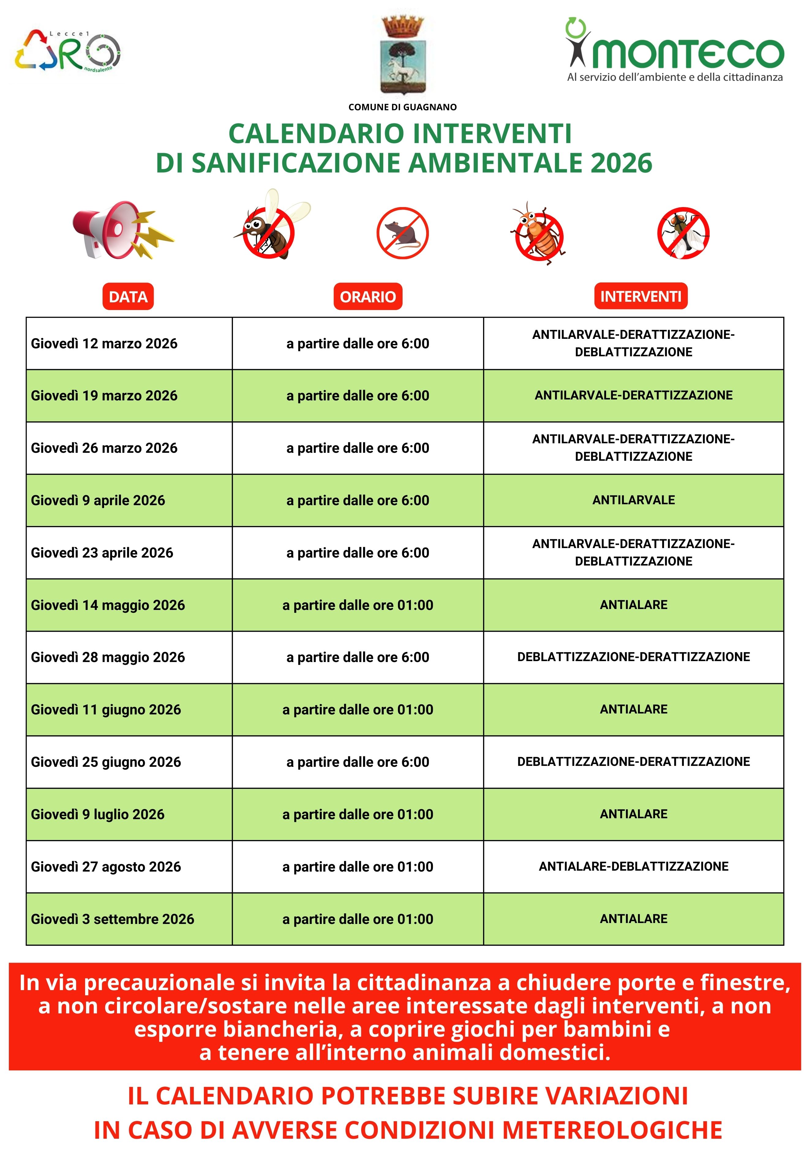 Per le date indicate nel calendario di INTERVENTI DI SANIFICAZIONE AMBIENTALE 2026, si invita tutta la cittadinanza del Comune di Guagnano 𝗮 𝗰𝗵𝗶𝘂𝗱𝗲𝗿𝗲 𝗽𝗼𝗿𝘁𝗲 𝗲 𝗳𝗶𝗻𝗲𝘀𝘁𝗿𝗲, 𝗮 𝗻𝗼𝗻 𝗰𝗶𝗿𝗰𝗼𝗹𝗮𝗿𝗲/𝘀𝗼𝘀𝘁𝗮𝗿𝗲 𝗻𝗲𝗹𝗹𝗲 𝗮𝗿𝗲𝗲 𝗶𝗻𝘁𝗲𝗿𝗲𝘀𝘀𝗮𝘁𝗲 𝗱𝗮𝗴𝗹𝗶 𝗶𝗻𝘁𝗲𝗿𝘃𝗲𝗻𝘁𝗶, 𝗮 𝗻𝗼𝗻 𝗲𝘀𝗽𝗼𝗿𝗿𝗲 𝗯𝗶𝗮𝗻𝗰𝗵𝗲𝗿𝗶𝗮, 𝗮 𝗰𝗼𝗽𝗿𝗶𝗿𝗲 𝗴𝗶𝗼𝗰𝗵𝗶 𝗽𝗲𝗿 𝗯𝗮𝗺𝗯𝗶𝗻𝗶 𝗲 𝗮 𝘁𝗲𝗻𝗲𝗿𝗲 𝗮𝗹𝗹'𝗶𝗻𝘁𝗲𝗿𝗻𝗼 𝗮𝗻𝗶𝗺𝗮𝗹𝗶 𝗱𝗼𝗺𝗲𝘀𝘁𝗶𝗰𝗶.